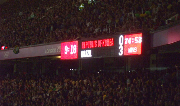 I giocatori asiatici non appaiono scossi dall’incertezza sulla loro esatta nazionalità, dal momento che nel primo quarto d’ora giocano nella metà campo brasiliana, e ci giocano pure bene. Il pubblico è onesto (non credo lo sarebbe altrettanto se giocasse la Gran Bretagna) e applaude le giocate di prima, le verticalizzazioni e i cambi di gioco da una fascia all’altra. Gli scambi lentissimi fra i quattro difensori verdeoro e i loro lanci lunghi rigorosamente preda dei coreani ricevono i meritati fischi di Old Trafford, mentre non riceve l’altrettanto meritato fischio dell’arbitro un gioco pericoloso di Juan Jesus a pochi metri dalla porta: i maxischermi agli angoli delle tribune confermano l’impressione che il rigore non sarebbe stato troppo generoso (personalmente sono a favore della moviola in campo, già averla sugli spalti è una grande comodità per gli spettatori!)